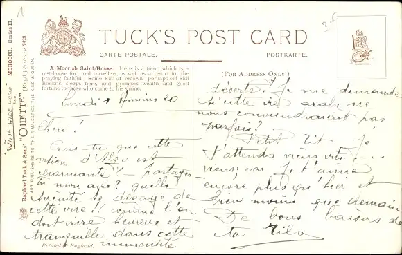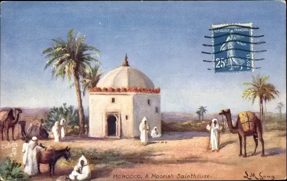 Künstler Ak Long, Marokko, General View of a Moorish Sainthouse, Camels, Tuck 7428