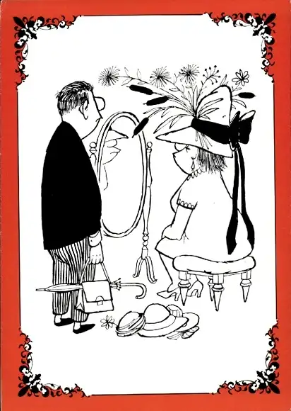 Künstler Ak Loriot, Frau vor dem Spiegel, Hutanprobe