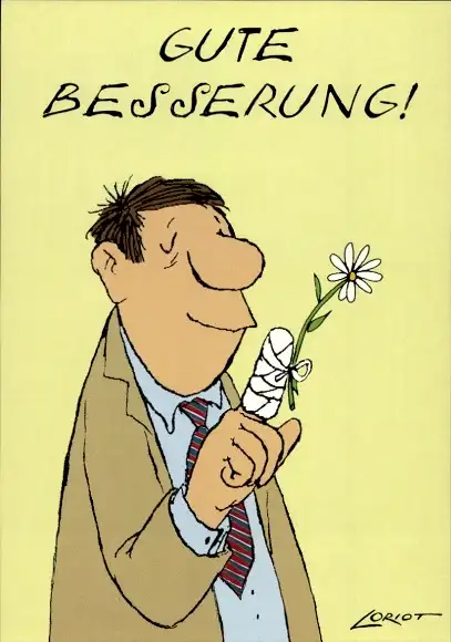 Künstler Ak Loriot, Gute Besserung, Mann mit verbundenem Finger, Blume