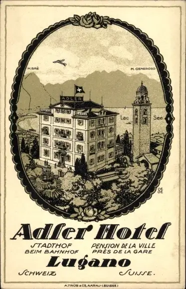 Künstler Ak Lugano Kanton Tessin Schweiz, Adler Hotel, Monte Bre, Monte Generoso