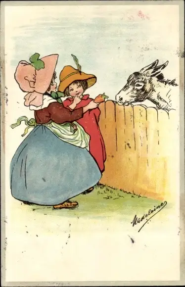 Künstler Ak Madeleine, Mädchen füttern einen Esel