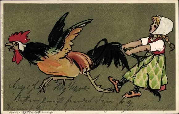 Künstler Ak Mädchen, Hahn, Was sich liebt das neckt sich