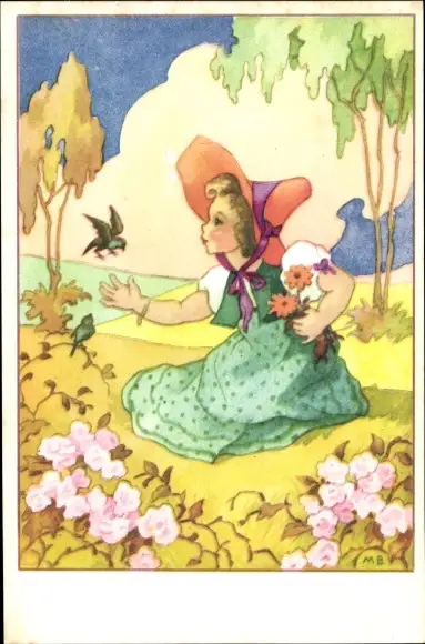 Künstler Ak Mädchen auf einer Blumenwiese, Vogel