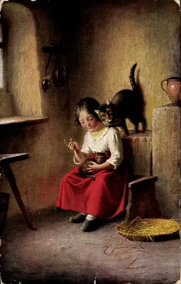 Künstler Ak Mädchen in rotem Rock mit zwei Katzen