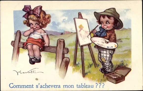 Künstler Ak Mädchen sitzt auf Zaun, Junge malt ein Portrait von ihr
