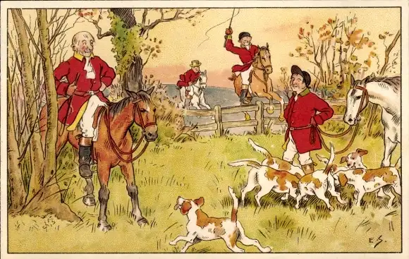 Künstler Ak Männer zu Pferden, Jagdhunde, Wiese