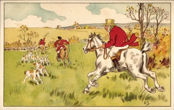 Künstler Ak Männer zu Pferden, Jagdhunde, Wiese
