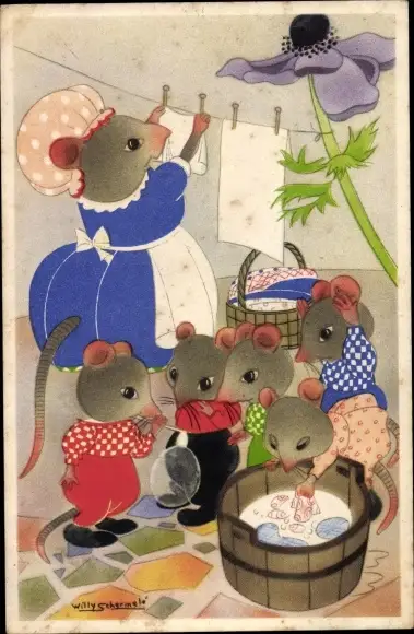 Künstler Ak Mäuse-Familie, Mutter hängt Wäsche auf, Seifenblasen, Waschwanne