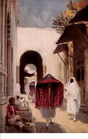 Künstler Ak Maghreb, Maurische Straßenszene, verschleierte Frauen