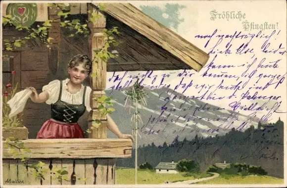 Künstler Ak Mailick, Frohe Pfingsten, Frau in Tracht auf einem Balkon