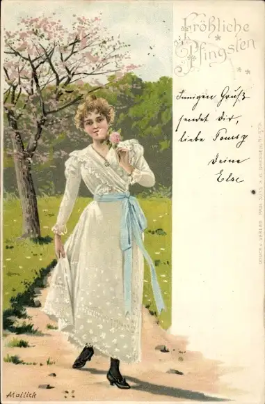 Künstler Ak Mailick, Frohe Pfingsten, Frau in weißem Kleid mit blauer Schärpe
