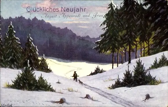 Künstler Ak Mailick, Glückwunsch Neujahr, Jagdszene, Winterlandschaft