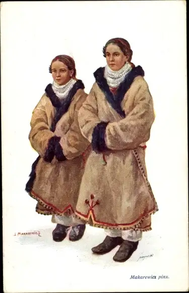 Künstler Ak Makarewicz, Zwei Mädchen in russischen Trachten, Wintermäntel