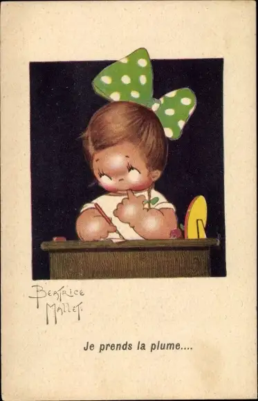 Künstler Ak Mallet, Beatrice, Je prends la plume, Mädchen mit Haarschleife, Schreibfeder