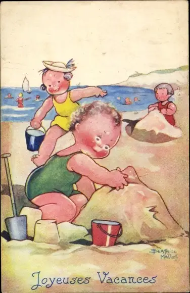 Künstler Ak Mallet, Beatrice, Joyeuses Vacances, Kinder am Strand