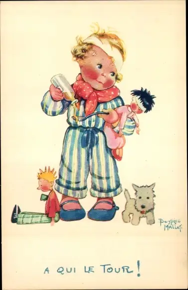 Künstler Ak Mallet, Beatrice, Kind mit Puppen, Hund