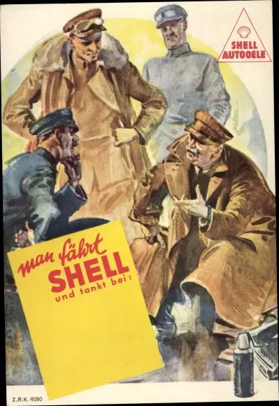 Künstler Ak Man fährt Shell, Reklame Shell Autooele, Chauffeure in Fahrerkleidung