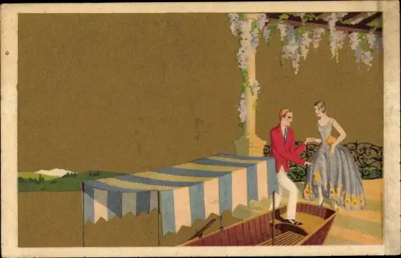 Künstler Ak Mann hilft eleganter Dame in ein Ruderboot