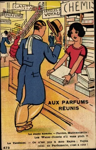 Künstler Ak Mann in einem Geschäft sucht die Toilette, Parfumerie