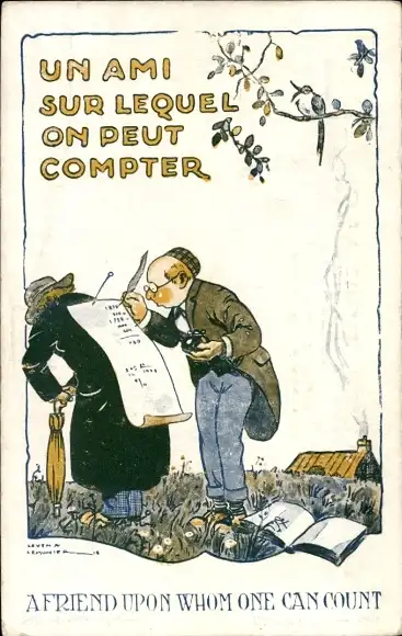 Künstler Ak Mann schreibt eine Liste, Mann mit Regenschirm, Humor