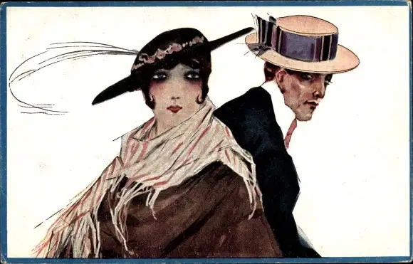 Künstler Ak Mann und Frau mit Hüten, Italiener