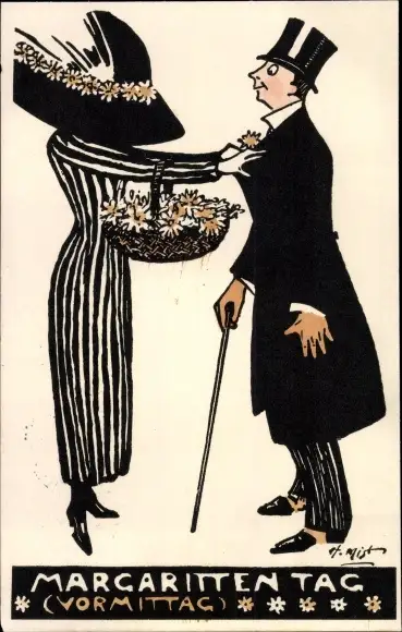 Künstler Ak Margaritten-Tag, Vormittag, Frau verschenkt Blumen, Nobler Mann