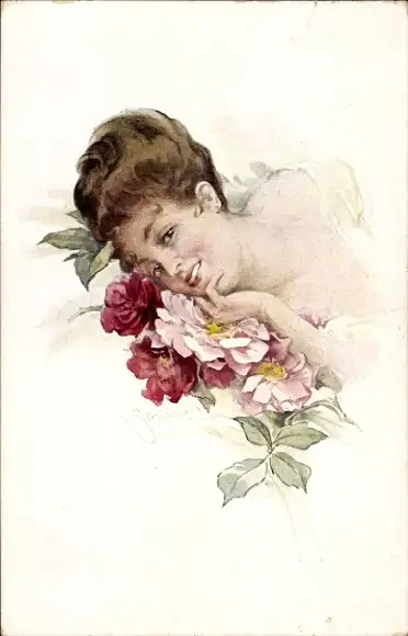 Künstler Ak Marke, Lächelnde Frau, Blumen