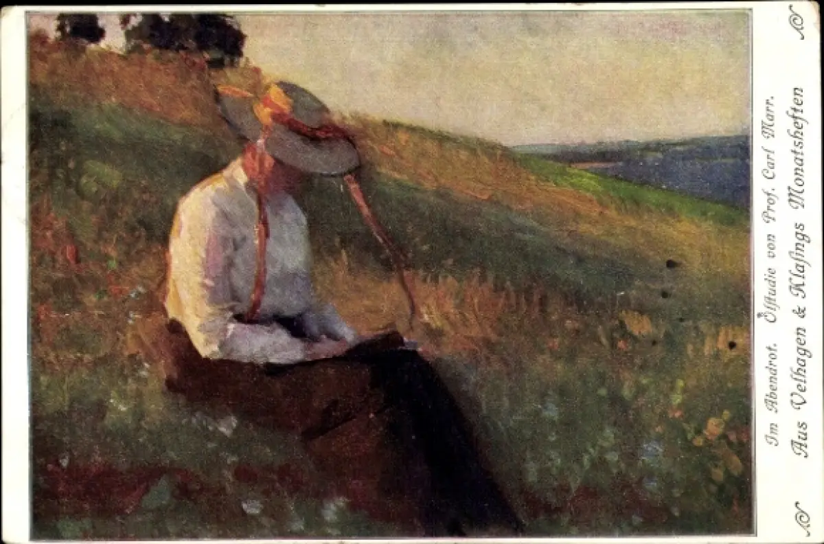 Künstler Ak Marr, C., Im Abendrot, Frau auf Blumenwiese