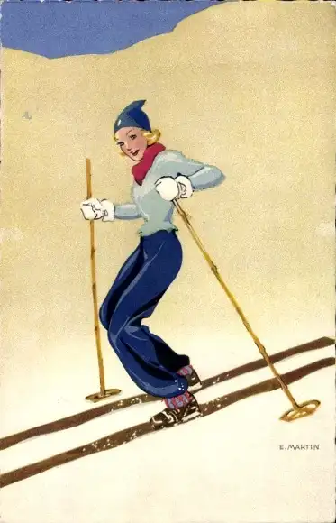 Künstler Ak Martin, E., Frau fährt Ski, Skifahrt, Wintersport