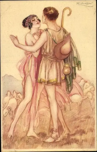 Künstler Ak Mauzan, Liebespaar, Schäfer, Schafherde