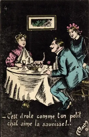 Künstler Ak Mazza, Paar beim Essen, Katze frisst vom Tisch