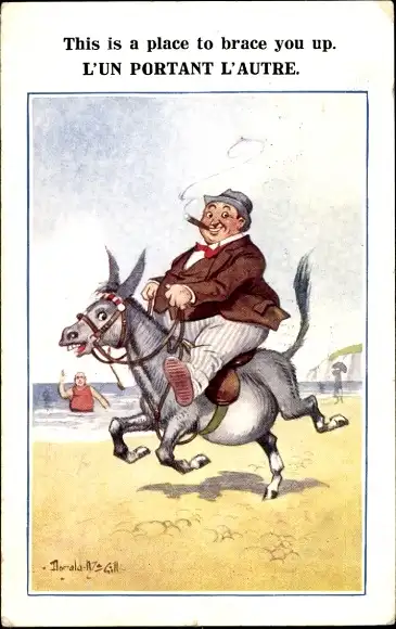 Künstler Ak McGill, D., Rauchender Mann reitet auf Esel, Strand