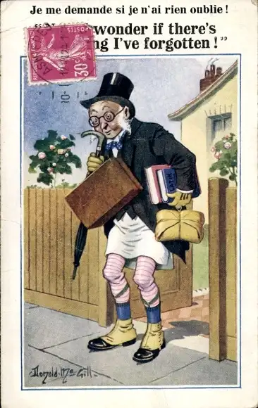 Künstler Ak McGill, Donald, Älterer Herr in Unterhose, Zylinder, Regenschirm