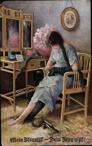 Künstler Ak Mein Strumpf, dein Strumpf, Mädchen stopft Strümpfe