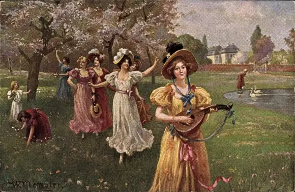 Künstler Ak Menzler, Frühling, junge Frauen auf einer Wiese, Laute