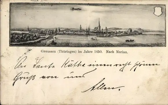 Künstler Ak Merian, Greußen in Thüringen, Stadt im Jahre 1650