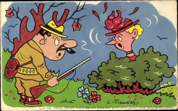 Künstler Ak Meunier, Jäger hat Vogelhut einer Frau getroffen