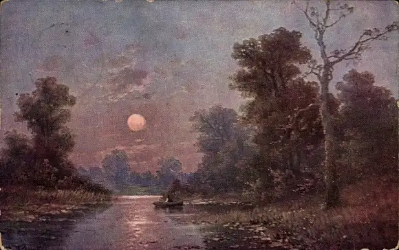 Künstler Ak Mondschein, See, Boot