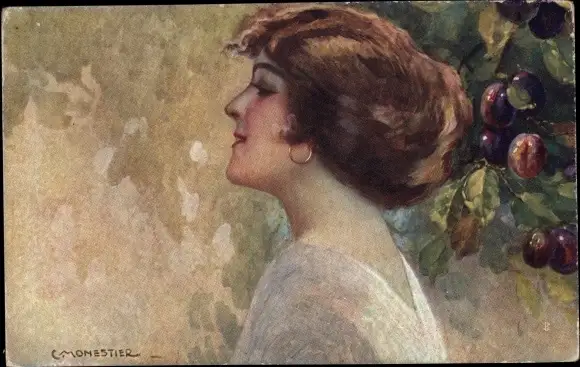 Künstler Ak Monestier, C., Portrait einer Frau, Pflaumen
