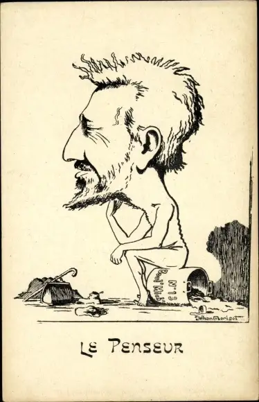 Künstler Ak Morisot, Nacker Mann auf einem Kochtopf sitzend, Le Penseur, Karikatur