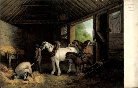 Künstler Ak Morland G., Der Stall, Pferde, Menschen