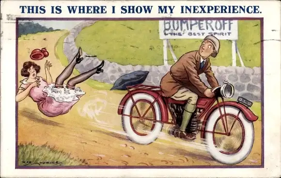 Künstler Ak Motorradfahrer fährt eine Frau um, Unerfahrener Fahrer, Motorrad
