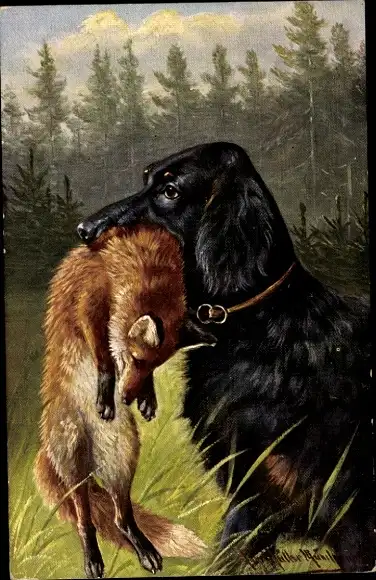 Künstler Ak Müller, August, Setter Hund mit erlegtem Fuchs, Jagd