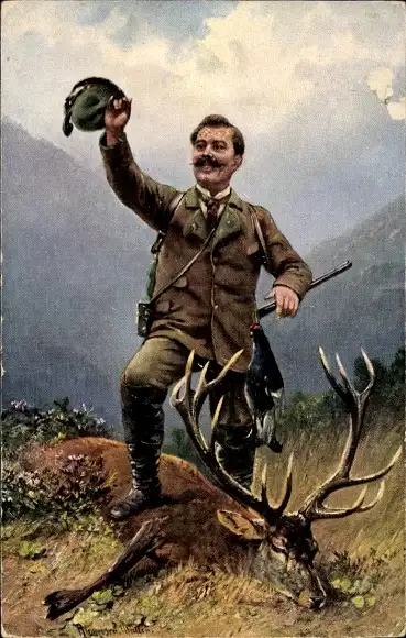 Künstler Ak Müller, August, Stolzer Jäger mit erlegtem Hirsch