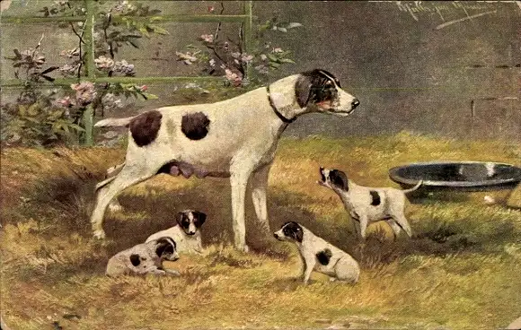 Künstler Ak Müller, August, Terrier, Hundemutter mit Welpen
