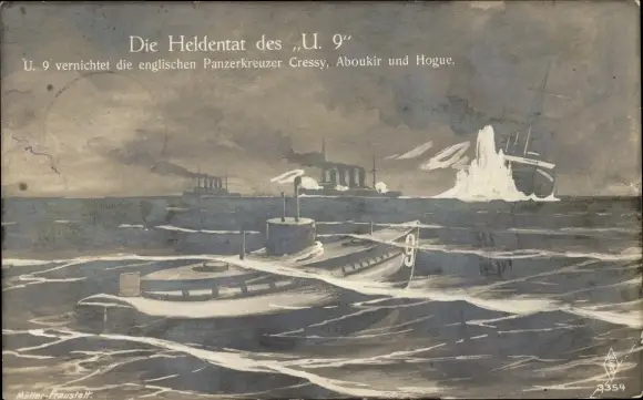 Künstler Ak Müller Fraustatt, Dt. Unterseeboot U9, engl. Panzerkreuzer Cressy, Aboukir, Hogue