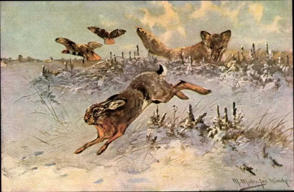 Künstler Ak Müller, M., Fuchs jagt einen Hasen