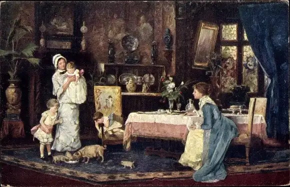 Künstler Ak Munkacsy, Zwei Familien, Kinder, Hunde
