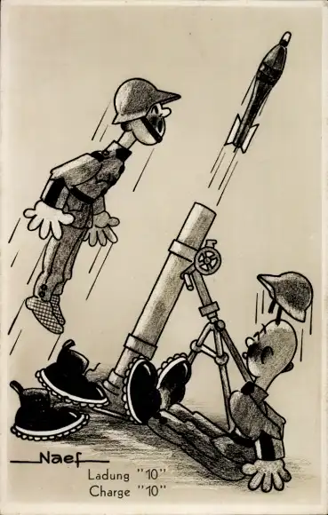 Künstler Ak Naef, Zwei Soldaten, Ladung 10, Humor, Geschütz