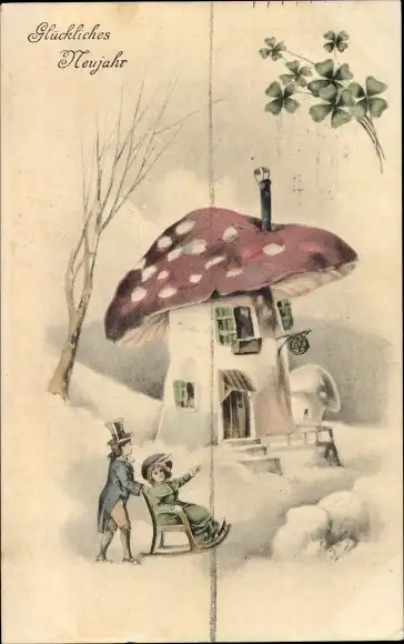 Künstler Ak Neujahr, Fliegenpilz Haus, Kleeblatt, Schlitten